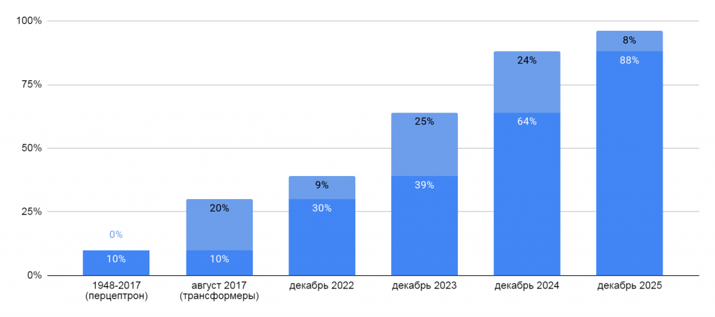 Процент достижения ИИ уровня AGI по оценкам ресурса lifearchitect.ai за 2025 год вырос с 88% до 96% (+8%). Для сравнения, в 2024 он вырос с 64% до 88% (+24%), а в 2023 — с 39% до 64% (+25%). Однако едва ли можно говорить о замедлении прогресса — его истинную динамику можно будет оценить только в ретроспективе. Не исключено, что в этой метрике ИИ в следующем году достигнет уровня 98-99% и будет пребывать на этой отметке еще несколько лет. Во всяком случае на сегодня 96-процентная готовность AGI представляется явно завышенной.
