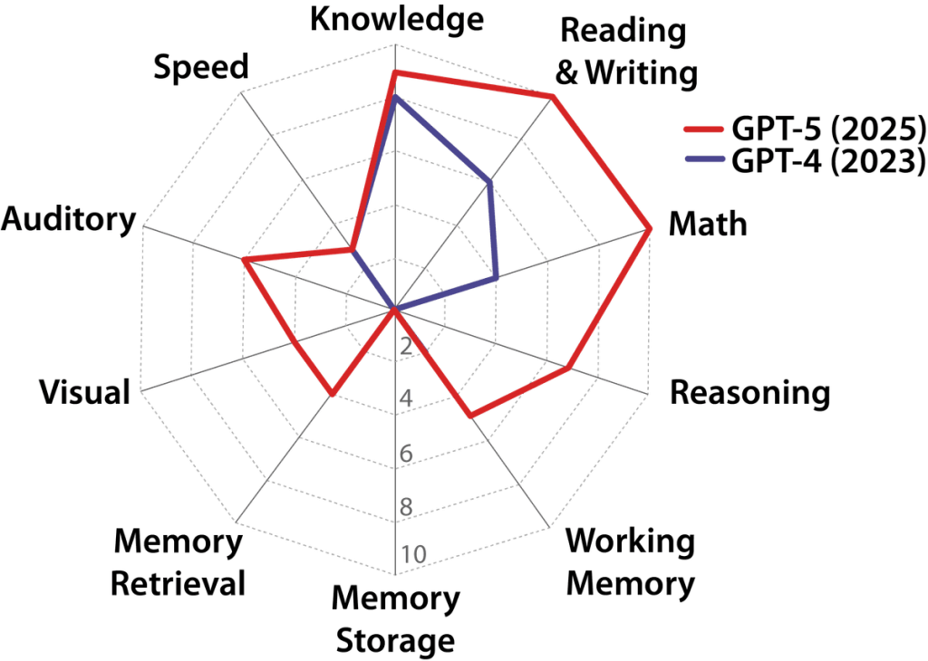 И если это лаконичное определение едва ли прибавляет понимания что такое AGI, то в самом бенчмарке это понятие раскрывается более полно. Бенчмарк представляет собой комплексный тест из десяти тестов, чьи вопросы охватывают общие знания, умение читать и писать, математику, способность рассуждать, работу с визуальным и звуковыми образами, запоминание и т.д. Для 100% соответствия AGI в каждом из этих тестов надо набрать по 10%, и вот как выглядит фактический результат у GPT-5 и его предшественника GPT-4: